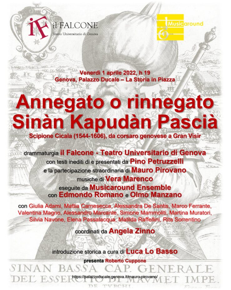 Con una performance fra lezione e spettacolo si conclude a Palazzo Ducale, Sala del Minor Consiglio, venerdì 1 Aprile 2022 alle 19 un percorso di ricerca e di studio compiuto da il Falcone Teatro Universitario di Genova in collaborazione con Vera Marenco e l’Associazione Musicaround intorno alla figura di Scipione Cicala detto Sinàn Kapudàn Pascià, corsaro genovese del Cinquecento, catturato dai Turchi ancora adolescente e in seguito ammiraglio della flotta turca e principale persecutore dei suoi concittadini – storia unica, non molto conosciuta se non attraverso qualche saggio universitario e l’omonima canzone di Fabrizio De André.