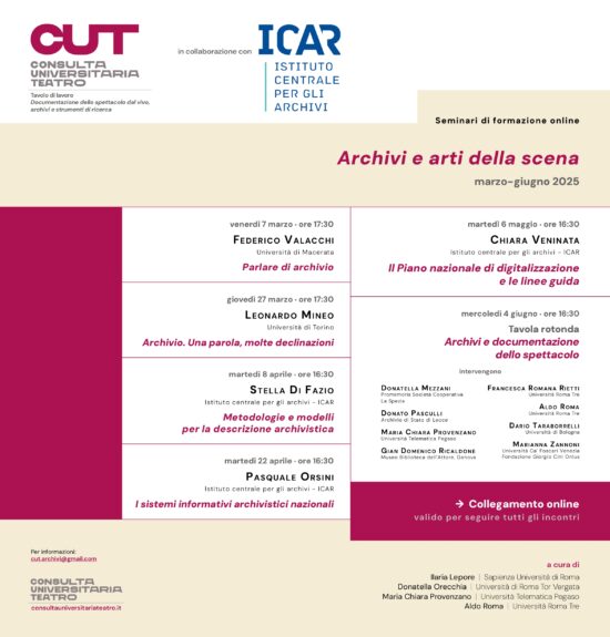 È previsto per l’8 aprile alle 16.30 il terzo incontro del ciclo di seminari di formazione online dedicato ad Archivi e arti della scena. Sarà tenuto da Stella Di Fazio,