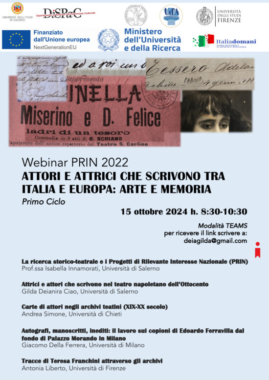 Mercoledì 15 ottobre p.v., dalle ore 8:30 alle 10:30, si terrà il Primo Ciclo di Webinar nell’ambito del PRIN 2022 “Attori e attrici che scrivono tra Italia