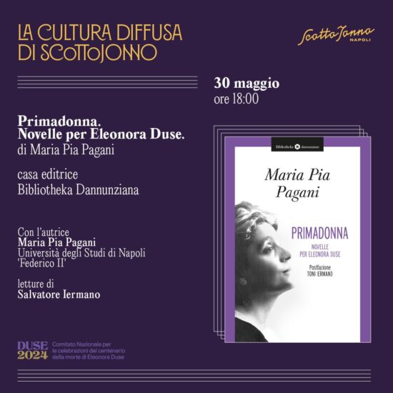 La presentazione del volume di Maria Pia Pagani Primadonna. Novelle per Eleonora Duse (Roma, Bibliotheka Edizioni, uscito il 5 aprile scorso) si terrà nello storico locale Scotto Jonno,