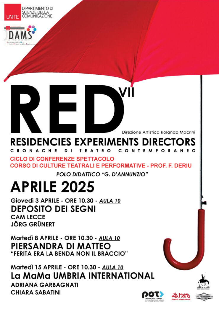 RED – Residencies Experiments Directors giunge alla sua settima edizione e viene presentato come Ciclo di Conferenze Spettacolo presso il DAMS dell’Università di Teramo in collaborazione con la Cattedra di Culture Teatrali e Performative del Prof. Fabrizio Deriu.