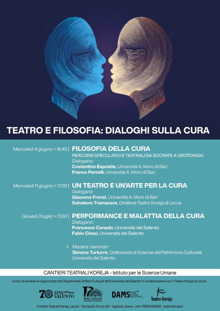 Si terrà nei mesi di giugno e luglio il ciclo di seminari dal titolo Teatro e filosofia: dialoghi sulla cura, organizzato dal Dipartimento di Beni Culturali dell’Università del Salento in collaborazione con il Teatro Koreja di Lecce e curato da Simona Turturro.