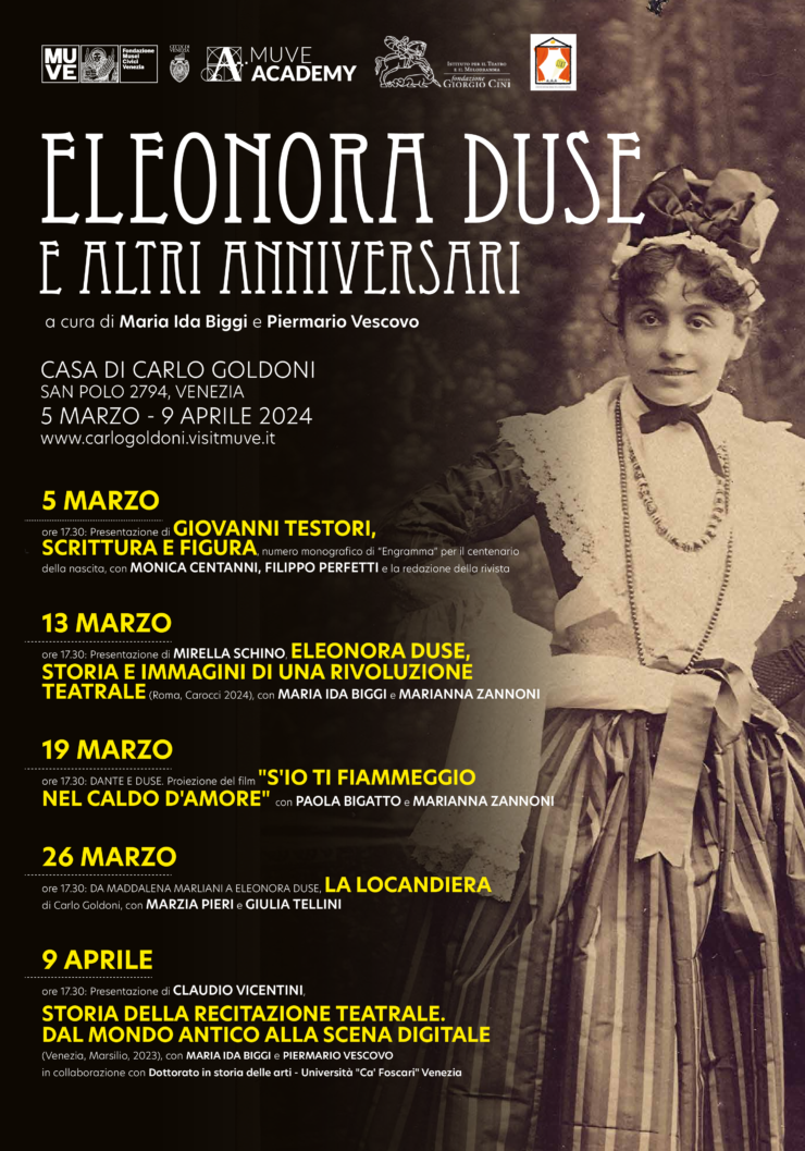In occasione dei cento anni dalla scomparsa di Eleonora Duse il Museo Casa di Carlo Goldoni e l’Istituto Internazionale per la Ricerca Teatrale danno vita a una serie di incontri e iniziative per approfondire non solo tematiche specifiche ma soprattutto per sottolineare importanti collegamenti trasversali. Dal 5 marzo 2024 una mostra di pannelli ha l’obiettivo di testimoniare la particolarità di un’artista rivoluzionaria, punto di riferimento non solo per la scena teatrale del suo tempo ma anche per la cultura italiana tra Otto e Novecento, sulla base dei documenti conservati nell’Archivio Duse dell’Istituto per il Teatro della Fondazione Giorgio Cini di Venezia.