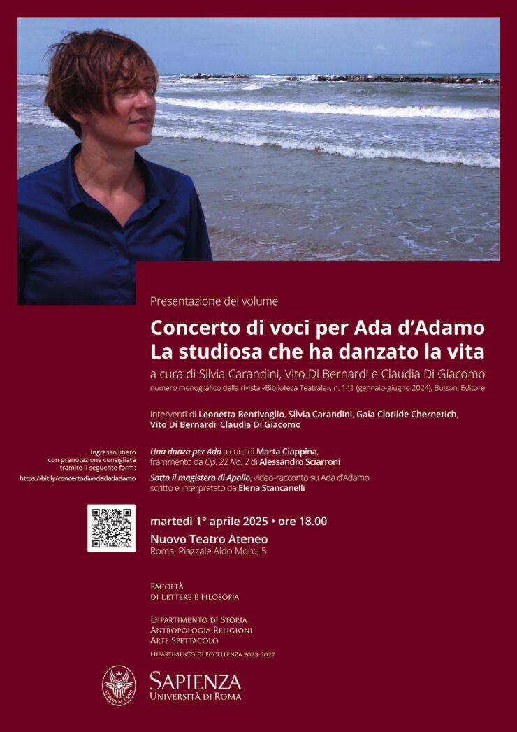 Il Concerto di voci per Ada d’Adamo. La studiosa che ha danzato la vita si terrà il primo aprile 2025 alle ore 18:00, al Nuovo Teatro Ateneo della Sapienza Università di Roma.