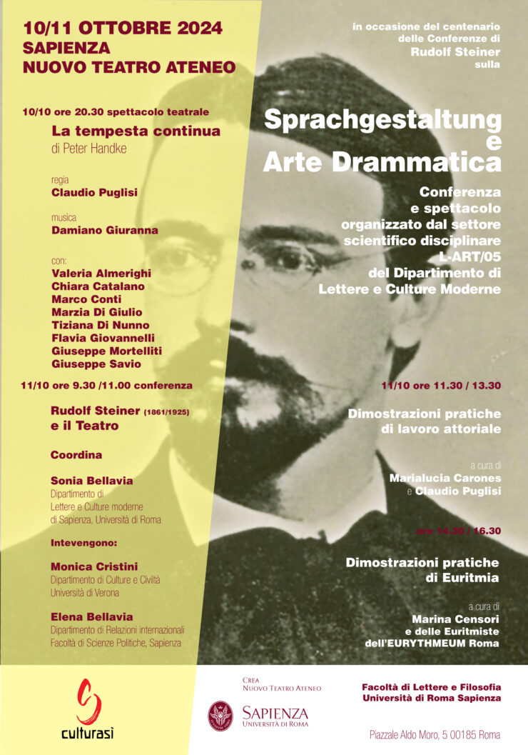 Iniziative promosse dai SociOttobre 1, 2024Ottobre 2, 2024 Conferenza “Rudolf Steiner e il teatro”. Spettacolo teatrale “La Tempesta continua” di Peter Handke – Roma, Sapienza Nuovo Teatro Ateneo, 10 – 11 ottobre 2024. DI Eleonora Luciani Continua a leggere Articolo precedente“Rencontre autour du théâtre d’André Gide” Parigi, 3 ottobre 2024Prossimo articolo“L’Officina di Opera Liquida: un incrocio di sguardi tra teatro e accademia”, Masterclass, 3° edizione, Milano – 24, 25, 26 ottobre