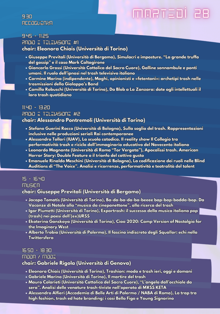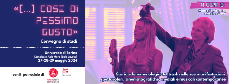 Da lunedì 27 maggio a mercoledì 29 maggio 2024 presso la Sala Lauree del Complesso Aldo Moro (via Verdi, 41- Torino), si svolge il convegno di studi «[…] cose di pessimo gusto». Storia e fenomenologia del trash nelle sue manifestazioni spettacolari, cinematografiche, mediali e musicali contemporanee a cura di Matteo Tamborrino e Andrea Zardi (Università di Torino).