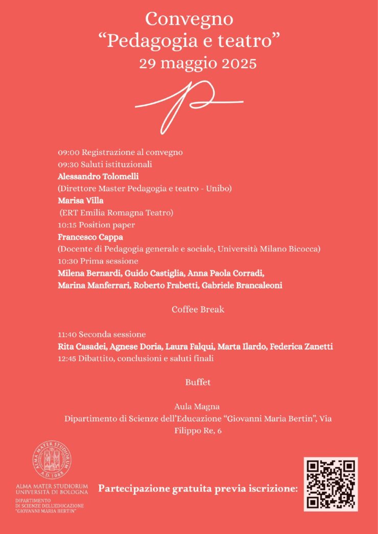 Il convegno Pedagogia e Teatro si terrà nell’Aula Magna del Dipartimento di Scienze dell’Educazione “Giovanni Maria Bertin” (Via Filippo Re, 6) dell’Università di Bologna il prossimo 29 maggio.