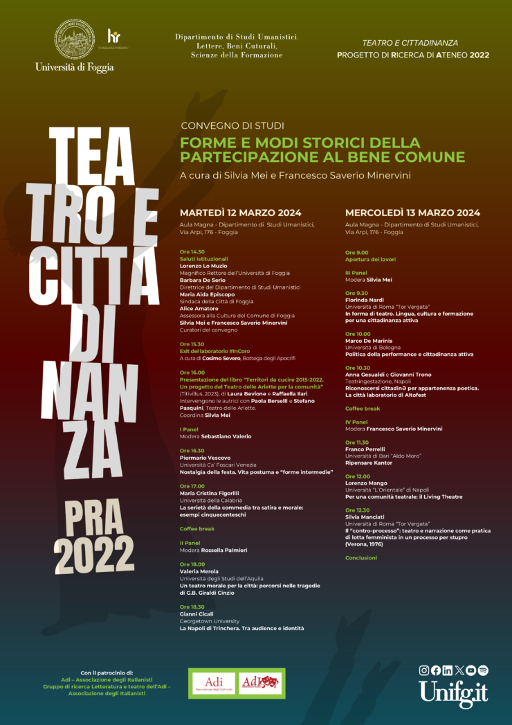 Il convegno di studi Teatro e Cittadinanza. Forme e modi storici della partecipazione al bene comune si svolgerà presso il Dipartimento di Studi Umanistici dell’Università di Foggia nei giorni 12 e 13 marzo.