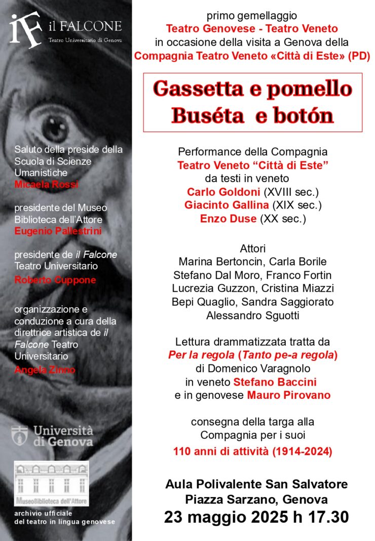 Avrà luogo il 23 maggio il primo gemellaggio ufficiale Teatro Genovese – Teatro Veneto con l’evento – Gassetta e pomello/ Buséta e botón e vedrà una mise en voix della Compagnia Teatro Veneto “Città di Este” con testi di Duse, Gallina, Goldoni e Varagnolo.