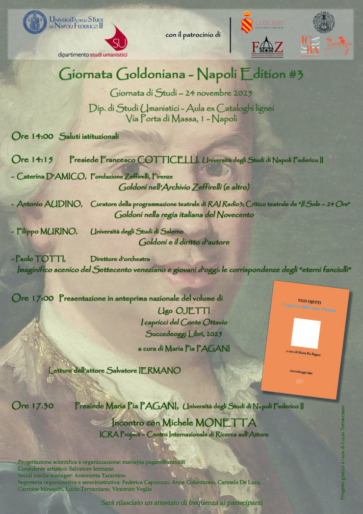 Con l’occasione della Giornata Goldoniana Napoli Edition #3, che si terrà il giorno 24 novembre 2025, verrà presentato in anteprima nazionale il volume di Ugo Ojetti, I capricci del Conte Ottavio (Roma, Succedeoggi Libri, 2025), curato da Maria Pia Pagani. In allegato la locandina e la copertina del volume.
