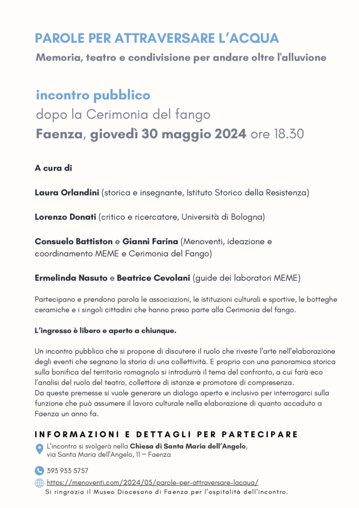 L’incontro, organizzato il 30 maggio a Faenza, stimolerà il dialogo fra teatro, mutamenti antropici e trauma, situandosi al termine di un processo di lavoro teatrale che ha accompagnato il post-alluvione in Romagna. L’incontro vedrà la presenza di artisti, oltre che di Lorenzo Donati (Università di Bologna) e di Laura Orlandini (Istituto Storico della Resistenza).