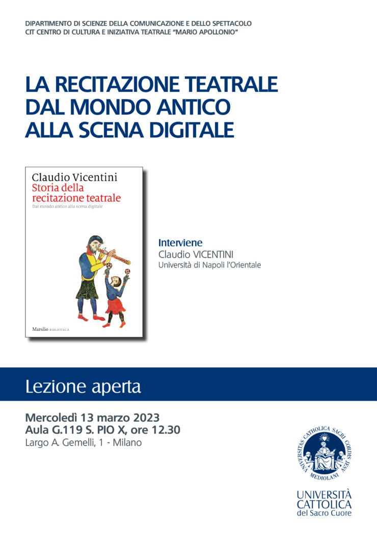 Iniziative promosse dai SociMarzo 3, 2024Marzo 3, 2024 Lezione aperta “La recitazione teatrale dal mondo antico alla scena digitale” – Milano, 13 marzo 2024 DI Matteo Tamborrino Continua a leggere Articolo precedenteCiclo “Eleonora Duse e altri anniversari” – Venezia, dal 5 marzo al 9 aprile 2024Prossimo articoloHeiner Goebbels, visiting professor a Genova – marzo 2024
