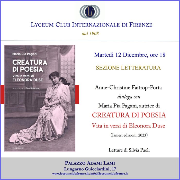 Iniziative promosse dai SociDicembre 8, 2023Dicembre 15, 2023 Presentazione del volume “Creatura di poesia. Vita in versi di Eleonora Duse” – Firenze, 12 dicembre 2023 DI Matteo Tamborrino Continua a leggere Articolo precedentePSA Journal (XXXVI) Journal of the Pirandello Society of America – Call for papersProssimo articoloConvegno “Giovanni Testori. Arte scrittura e teatro. Studi e scoperte d’archivio” – Milano, 14-15 dicembre 2023 + Novate Milanese, 16 dicembre 2023