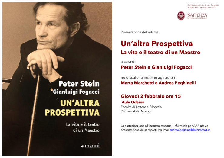 Giovedì 2 febbraio, alle ore 15, presso l’Aula Odeion della Facoltà di Lettere e Filosofia dell’Università di Roma “La Sapienza” (piazzale Aldo Moro, 5), presentazione del volume Un’altra prospettiva. La vita e il teatro di un Maestro, a cura di Peter Stein e Gianluigi Fogacci. Ne discutono, insieme agli autori, Marta Marchetti e Andrea Peghinelli.