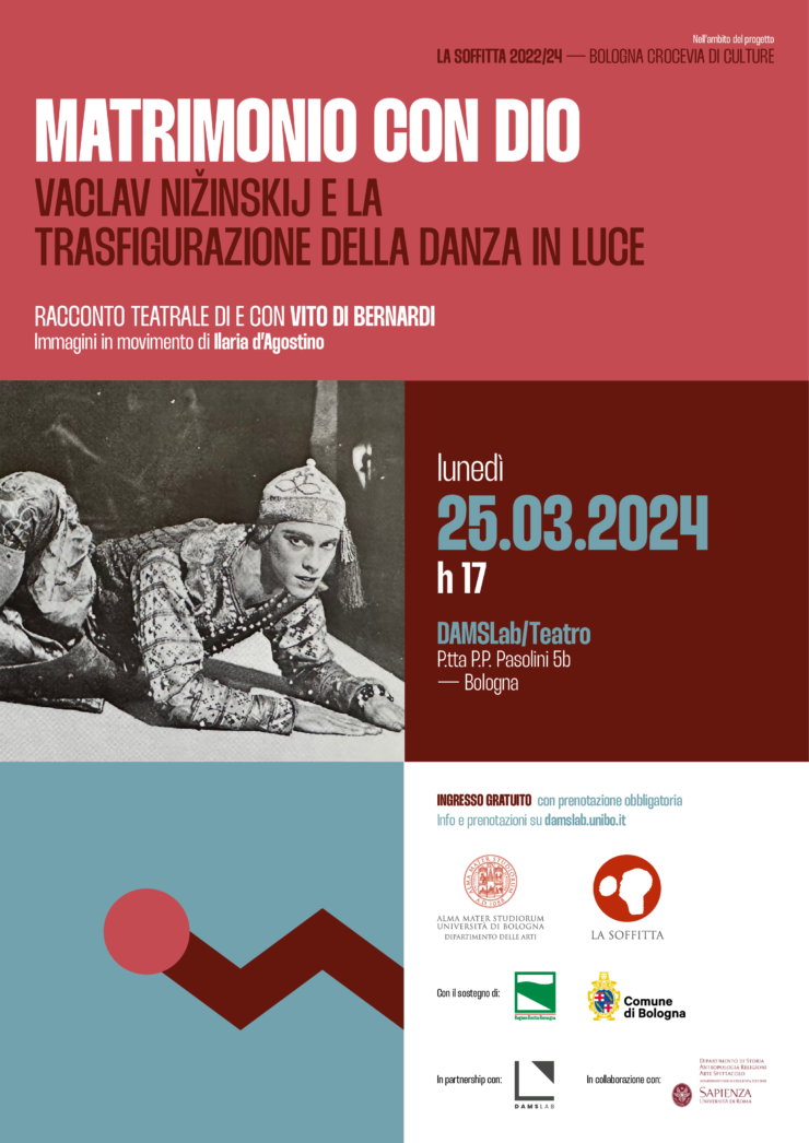 Lunedì 25 marzo, alle ore 17:00, nell’ambito della stagione del Centro La Soffitta del Dipartimento delle Arti dell’Università di Bologna, Vito Di Bernardi presenterà il racconto teatrale Matrimonio con Dio. Vaclav Nižinskij e la trasfigurazione della danza in luce, al quale ha collaborato Ilaria d’Agostino per le immagini.