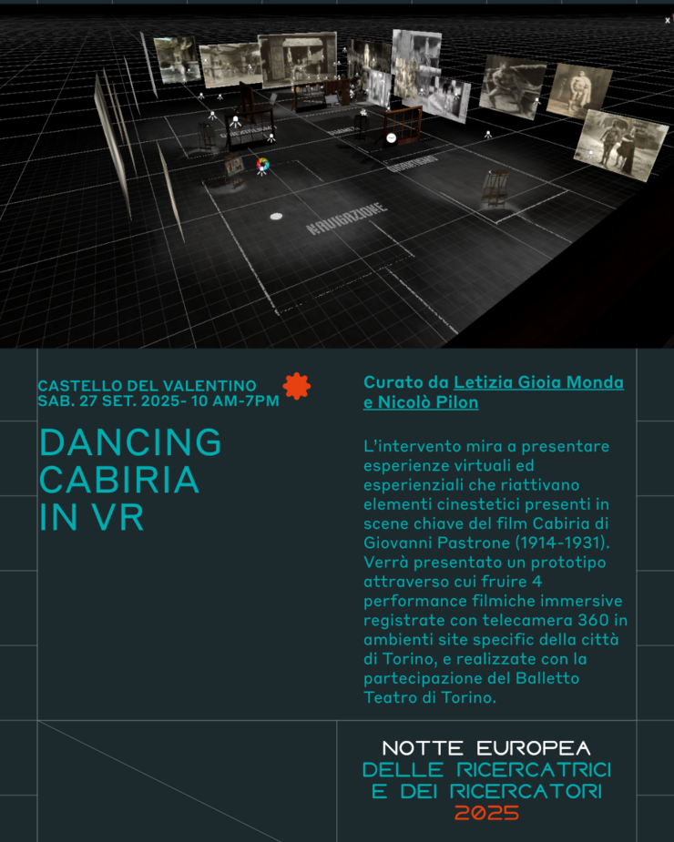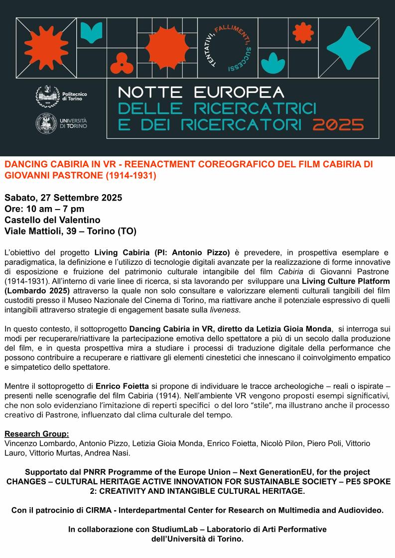 Nel contesto di Unight – Notte Europea delle Ricercatrici e dei Ricercatori, sabato 27 settembre 2025, dalle ore 10 alle ore 19. presso il Castello del Valentino (Torino), sarà presentata una Demo del prototipo in via di sviluppo VR LIVING CABIRIA WEB per il progetto PNRR Living Cabiria diretto da Antonio Pizzo.
