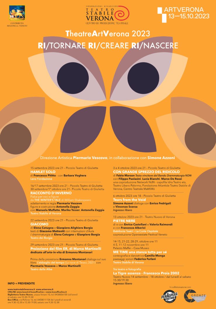 L’edizione 2023 di TheatreArtVerona si svolge dal 15 settembre al 12 novembre prossimi e ha come sottotitolo “Ri-tornare, ri-creare, ri-nascere”. La rassegna, organizzata dal Teatro Stabile di Verona in collaborazione con la fiera d’arte moderna e contemporanea Art Verona e con il contributo della Regione del Veneto, ha in programma spettacoli di prosa e danza, film d’ambito teatrale, incontri e una mostra fotografica, tutto all’insegna della sperimentazione, della ricerca, della pluralità dei linguaggi, delle contaminazioni.