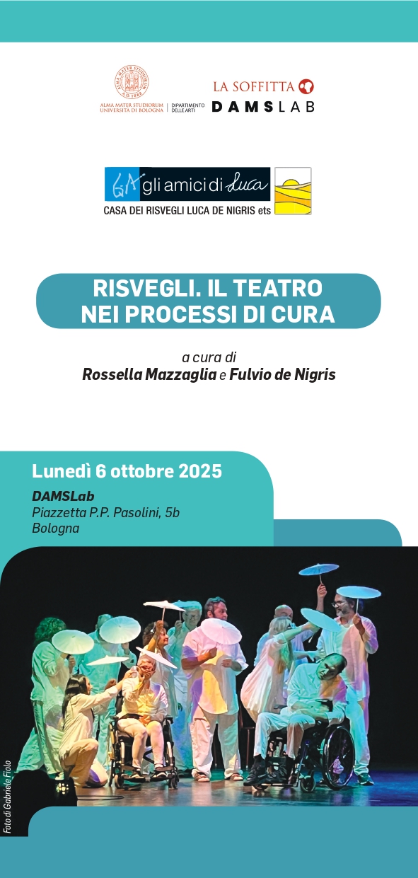 A Bologna il 6 ottobre si terrà Risvegli. Il teatro nei processi di cura. L’evento, organizzato per la Giornata dei Risvegli, è curato da Rossella Mazzaglia e Fulvio de Nigris de Gli Amici di Luca. Si susseguiranno un workshop teatrale, un convegno interdisciplinare, un’installazione creativa coi bambini delle scuole elementari sui temi della cittadinanza e dell’inclusione e una performance partecipativa.