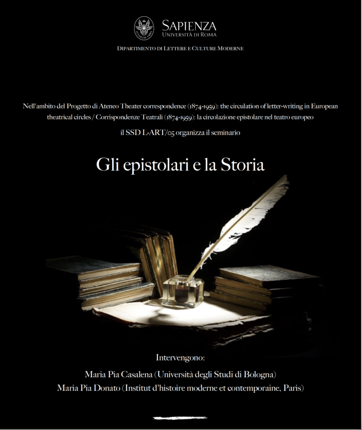 L’evento èorganizzato dal SSD L-ART/05 nell’ambito del progetto di Ateneo Theater correspondence (1874-1959): the circulation of letter-writing in European theatrical circles, from its advent to the challenges of modern directing, di cui è responsabile Sonia Bellavia. Il seminario si avvarrà dell’intervento delle storiche Maria Pia Casalena/Università di Bologna e Maria Pia Donato, direttrice del Centro Ricerche dell’Institut d’histoire moderne et contemporaine di Parigi.