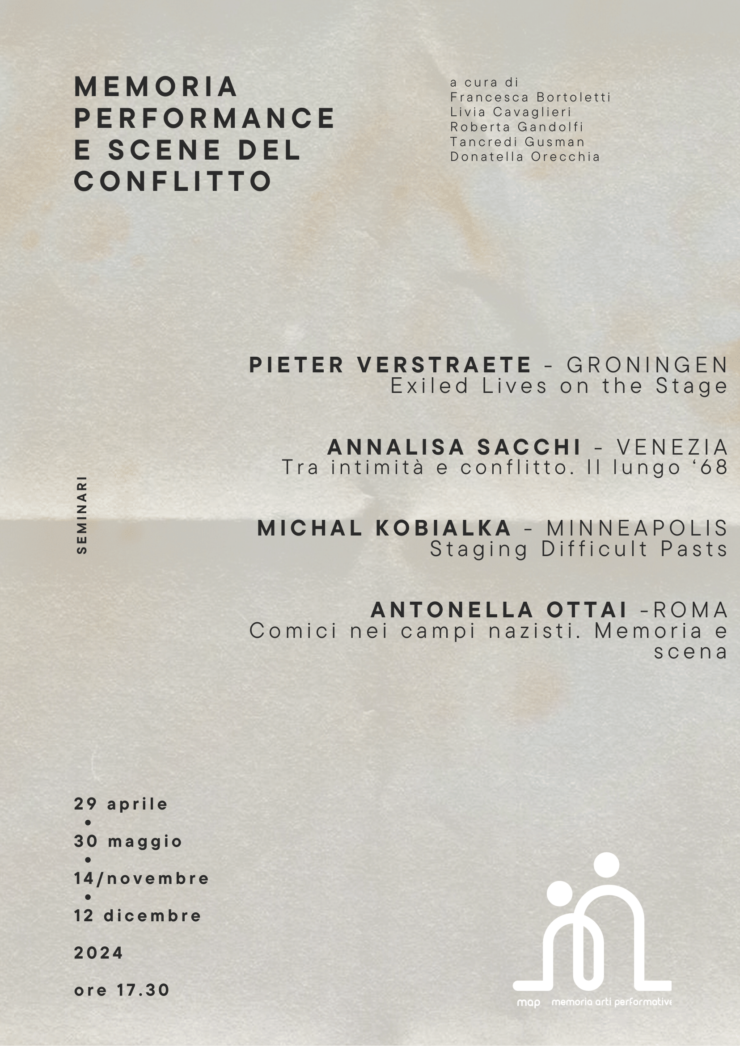 Il seminario “Memoria, performance e scene del conflitto” – organizzato dal Centro interateneo per la memoria delle arti performative (MAP) – coinvolgerà studiose e studiosi che hanno lavorato negli ultimi anni intorno a tali temi da prospettive molto diverse, svolgendosi interamente online.