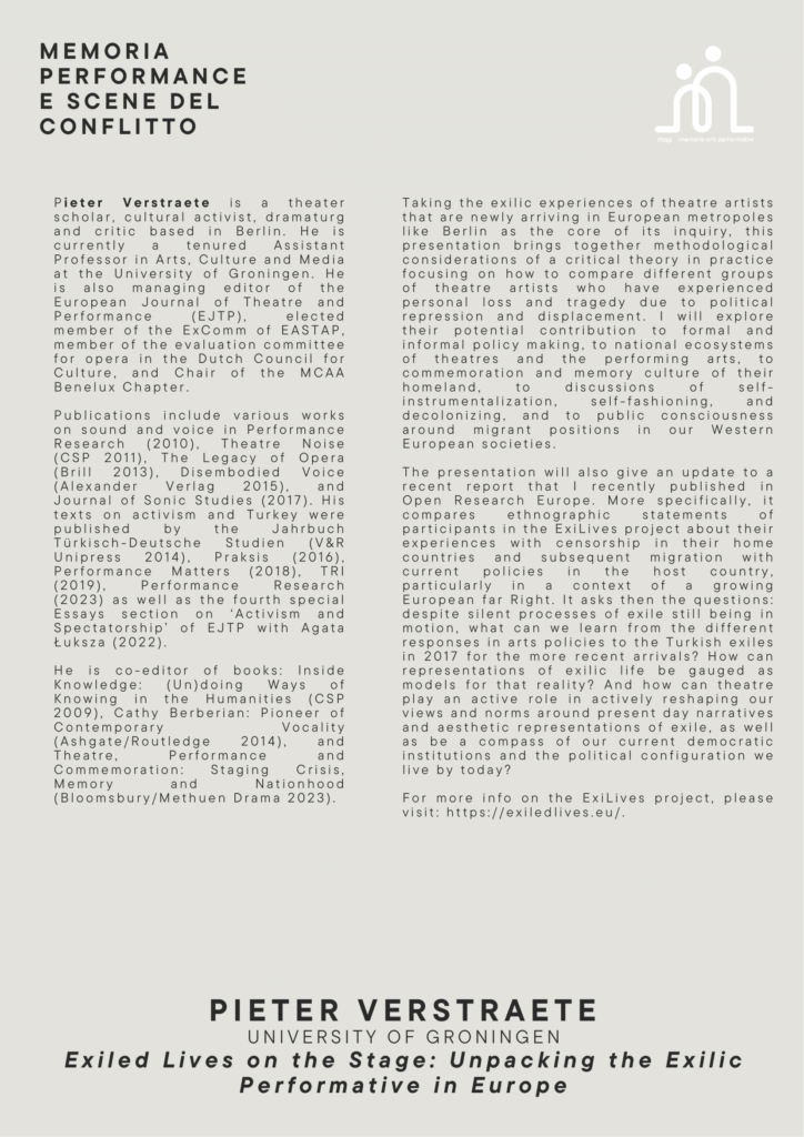intervento dal titolo Exiled Lives on the Stage: Unpacking the Exilic Performative in Europe.